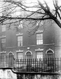 by tall railings rising from a low brick wall. No. 12 is one of three
