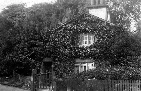 The lodge has a stone porch for the gatekeeper to sit in and the open driveway gate can be seen at an angle at the bottom left of the old photo.