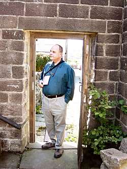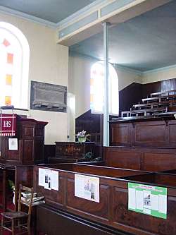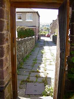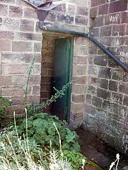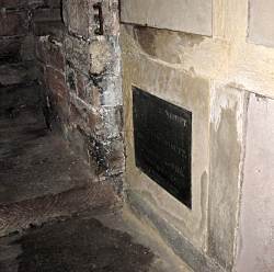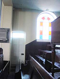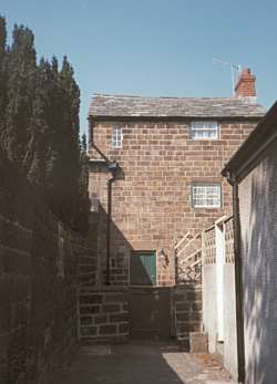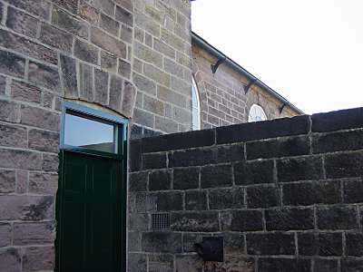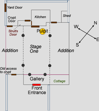 We begin with the older Unitarian Chapel at the bottom of Green Lane, Belper. This building was erected around 1721 and in 1740 galleries were added, making it capable of seating 250 people. After the new Chapel was built by Jedediah Strutt, this older building was extended, and then used for the Sunday School in 1855. Here's the plaque over the front door of the old chapel, giving the dates 1721-1855. Going around the back of the old chapel, we see it attached to a commercial property who now use the chapel as part of their enterprise. Notice the metal window in the lower, older, part and the sash window in the upper extension. We are standing in Green Lane car park, which was once the site of Green Hall, residence of the Strutts in Belper. Therefore the Unitarian Chapel would have been on their doorstep. This closer look at the back of the old chapel shows more clearly the metal small-paned window common to older buildings in Belper, and the side door to the chapel. Now we move on to the new Unitarian Chapel in Field Row, Belper. This is the Chapel built by the Strutt family. As you can see, the chapel has a long frontage, and is attached to a tall, three-storey cottage on the right-hand side. This cottage is accessed by a side-gate and a short path. Beyond the cottage gateway and up the path, we can see the cottage more clearly. Looking at the front of the chapel again, focus on the section of front wall at the left-hand side. This is where the coffins once went into the crypt, on a conveyor. Today it is blocked by stones. Go to the next photograph for a close-up. You will see quite plainly the hole in the wall just large enough for the coffin to trundle in on its specially-designed conveyor belt. This section of the chapel was built at a later stage, to house the crypt underneath it and extra seating above. Here is the section of chapel underneath which is the crypt. We are looking at the side of the chapel, from the Field Row gardens. Notice that the arched windows of this later section are different to the square window of the original chapel, which protrudes further out into the chapel yard. Now we are inside the crypt, on the other side of that former opening in the wall, looking toward it. You can see the roller mechanism for handling coffins, and empty spaces awaiting them. Jedediah Strutt and some of his family members are buried down here. Here's one of the burial plaques - dedicated to a Strutt, though I'm afraid I don't know which one. It's pitch black down there, so I couldn't read it. Coming out of the crypt up into the fresh air and sun again, we step back from the door into the little yard at the back of the chapel. Look at the plan beneath to get your bearings. Now look to your right and you'll see the yard door. The yard door leads out into Short Rows. This was long ago the path leading to the front entrance of the chapel, but is now unused except by local residents. Now we're looking at that yard door from the other end of the path, as if walking towards the chapel. Back through the yard door, and into the chapel yard. This shows the porch and kitchen extensions at the back of the chapel, and the back entrance. Unseen to the right of this shot is the crypt door. See the plan below for orientation. Walking beyond the kitchen extension, behind it we find another, unused, door into the chapel. This is in a slightly newer stage of the chapel building, as we shall see in other pictures. In the previous photo, and in this, you can see the join where the original rectangular chapel met the newer addition to the side. If you could go through that door into the chapel, this would be the way you'd come in. We are now standing halfway up an elevated row of pews at the east side of the chapel. See how the arched window is missing a piece of cornice at the top? I'd suggest the arched window was a later modification. Earlier windows were rectangular, as we saw at the front of the chapel. Stepping back from that doorway a little, you can see more clearly the way the original chapel has been opened up, put onto metal pillars, and extended out to the side. Turn around and look the other way, towards the front of the chapel. Here you see the other end of that opening, again with a supporting pillar. This would be a good time to look at the front entrance as it is today, and the gallery above it. I understand that this south entrance was not the original. The entrance was at first in the north end, where the yard is today. We can look at that original entrance in a moment. First, though... ....here's a close-up of the old clock on the gallery front, still keeping good time. It reputedly part of the original chapel, having been made by the famous Derbyshire clockmaker John Whitehurst 1713-1788). It is said that the Strutt family were also clockmakers. Swivel to your right, and here is the view looking towards the west side of the chapel. Now we are looking at the entire west end of the chapel. The portion right at the back is over the crypt. Like the eastern addition, this part was built out later, for the very purpose of providing a crypt and more room for pews. In the far right-hand corner, unseen behind a wooden screen, is the private entrance that the Strutt family used. Here is the Strutt door on the outside of the building. It is located in the porch in the back yard, and a little stair-well winds over the crypt door and leads into the chapel half-way up the pews. Back inside, we now turn to look down the north side, and we can see that original entrance door I told you about; and beside it is the pulpit. As you see, the original entrance is sandwiched between two windows. On the wall above is a large plaque to the Strutt family. Here is a close-up of the plaque. Thank you for viewing. Perhaps you'd like to browse on the website for a little while longer. There is more information here about the Strutts, the Unitarians and their chapel, and about Belper in general. But if you are 