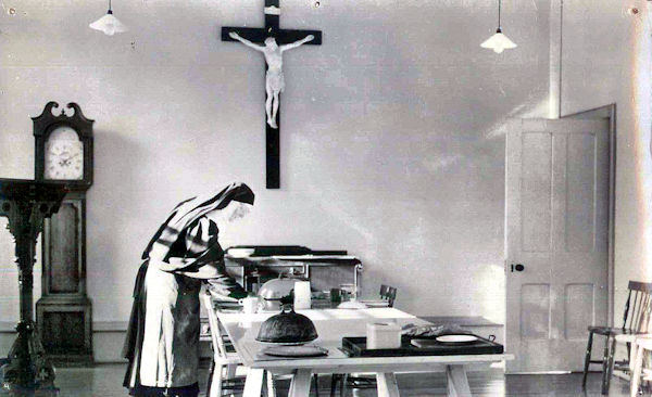 PHOTO: Postcard of Sister Joyce, Mistress of Novices, laying one of the tables in the refectory. There was a small "shop" situated in the cloister, which sold religious mementos and postcards of the convent for visitors.